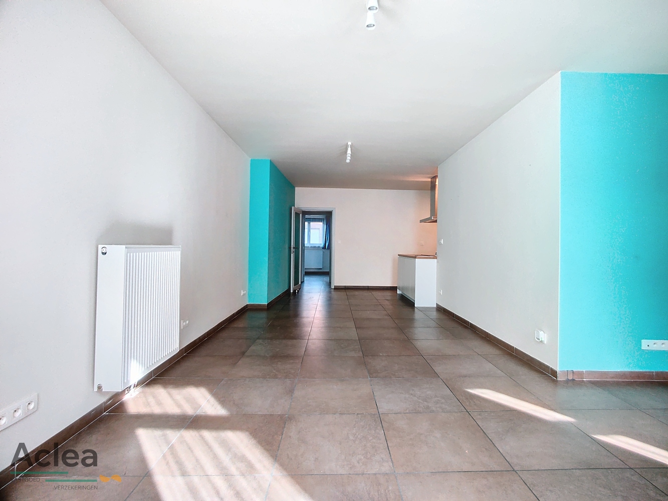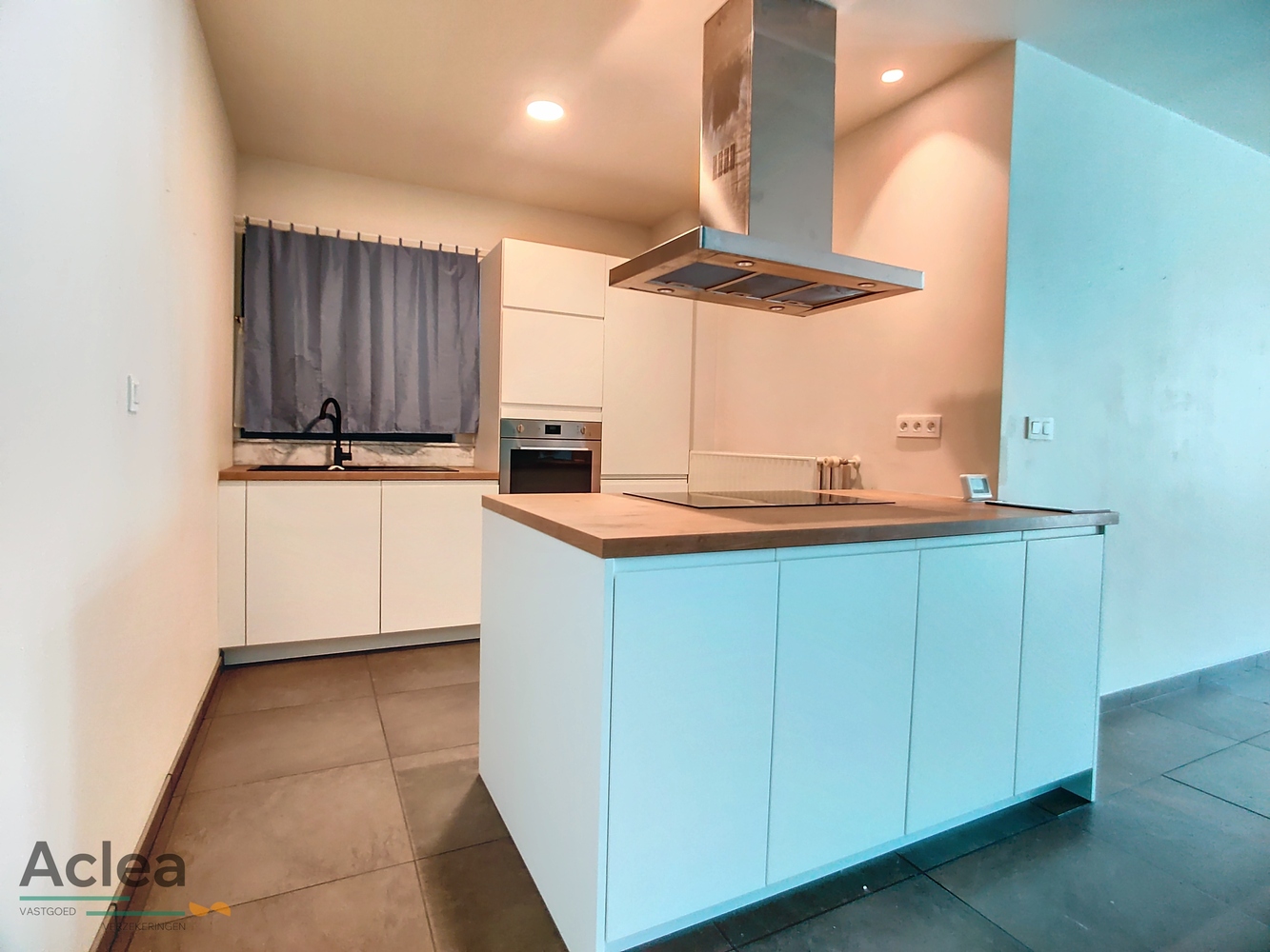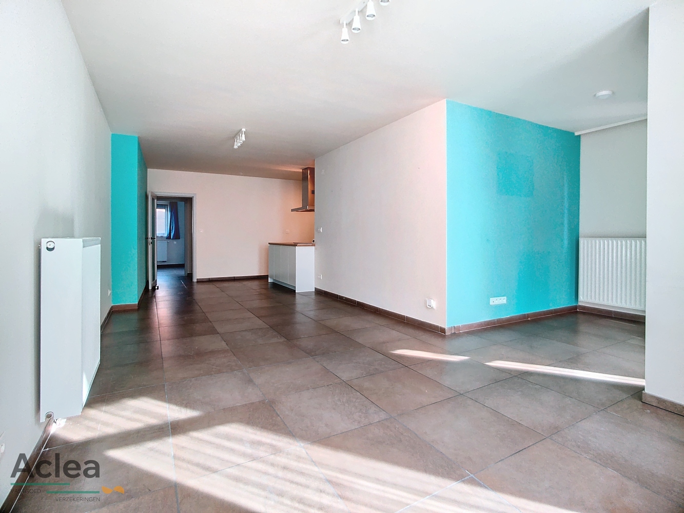 inkom, living met open ingerichte keuken, 2 slaapkamers, badkamer met inloopdouche en lavabomeubel, apart toilet, bijkeuken, garage met onmiddellijke toegang tot het appartement en zonneterras achteraan (wordt nog afgewerkt)