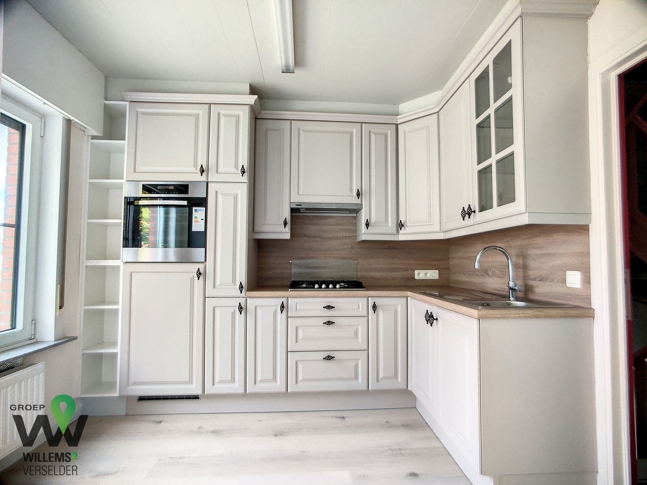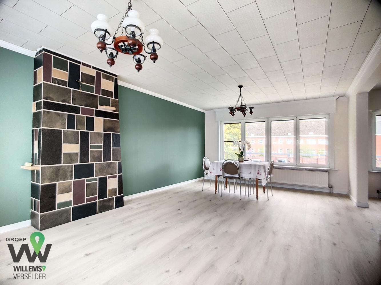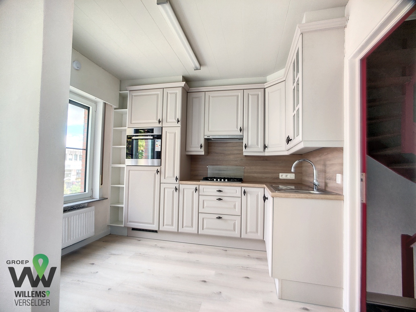 op het eerste verdiep : toilet en living met nieuwe ingerichte keuken