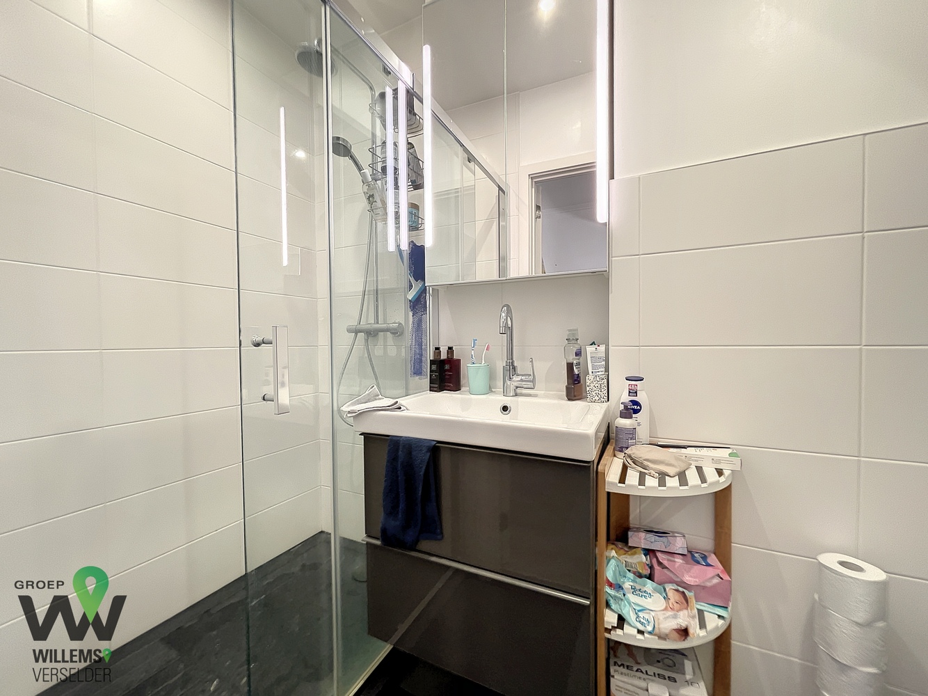 – moderne badkamer met inloopdouche, hangtoilet en badkamermeubel