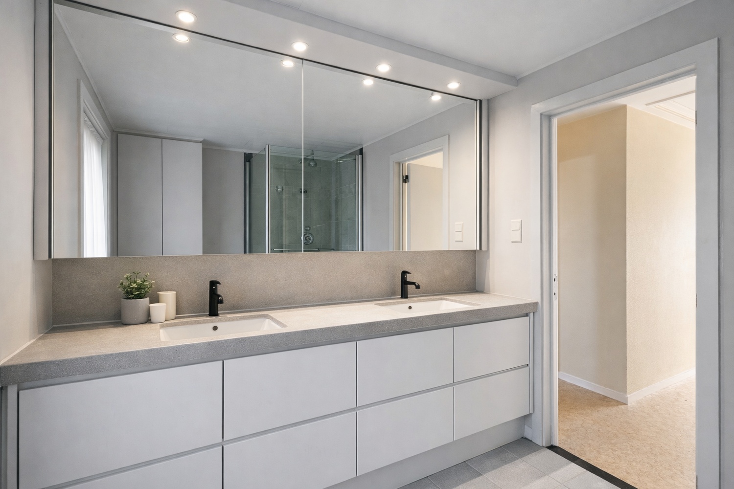 – ingerichte badkamer met badkamermeubel, toilet en douche
