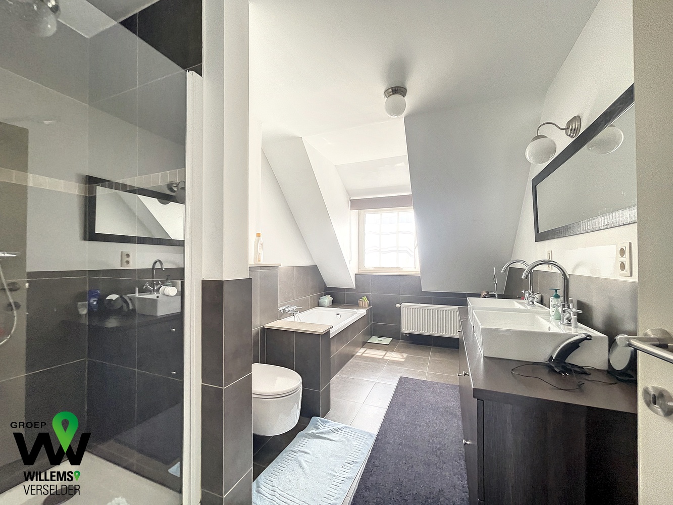 inkom, toilet, living met open ingerichte keuken, berging/wasplaats, zonneterras achteraan, 3 slaapkamers op 1e verdiep, berging/dressing, ruime badkamer met toilet, douche, ligbad en badkamermeubel met dubbele lavabo, 4e slaapkamer op het 3e verdiep, garage en autostaanplaats achteraan het gebouw.