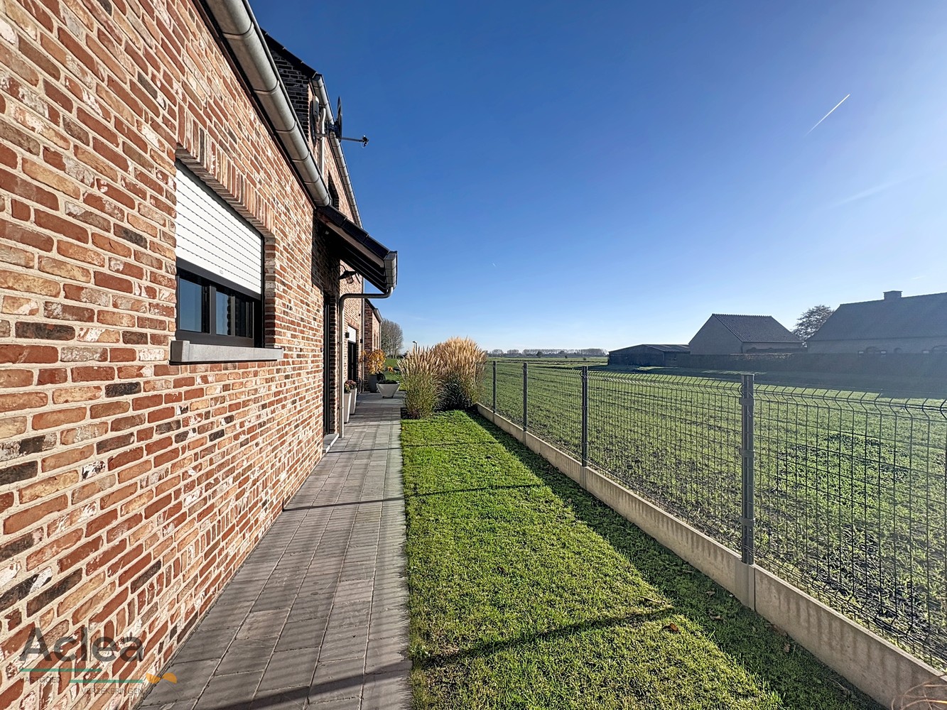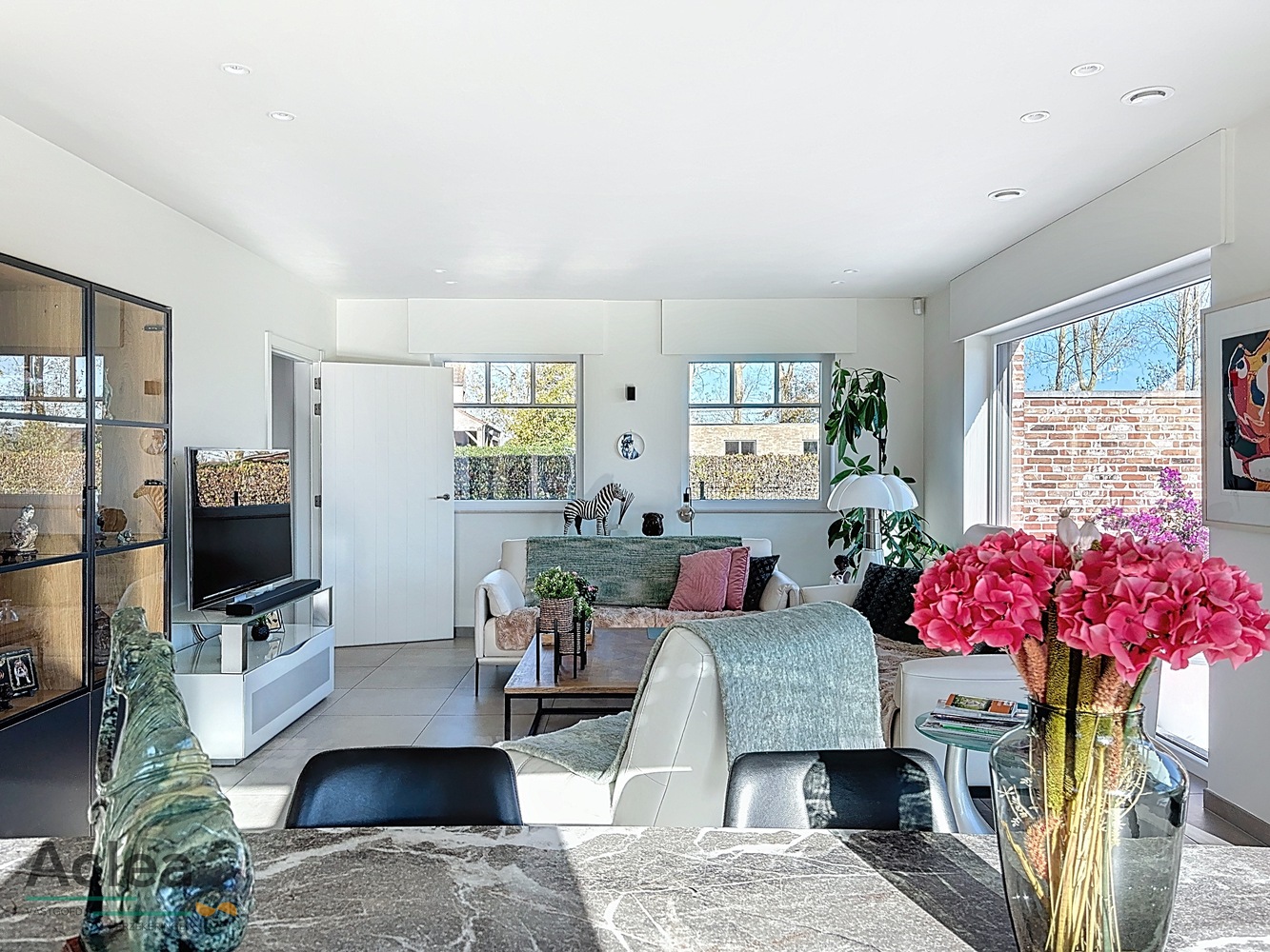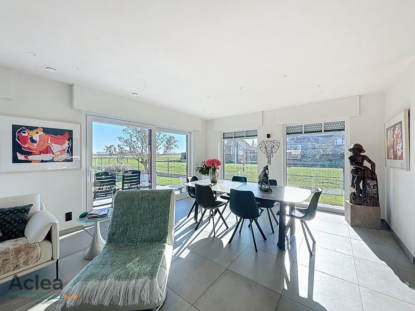 Bij het binnenkomen word je verwelkomd door een ruime inkomhal die leidt naar een grote, lichtrijke woonkamer. Dankzij de royale raampartijen geniet je van overvloedig daglicht en een adembenemend zicht op de omliggende weilanden.