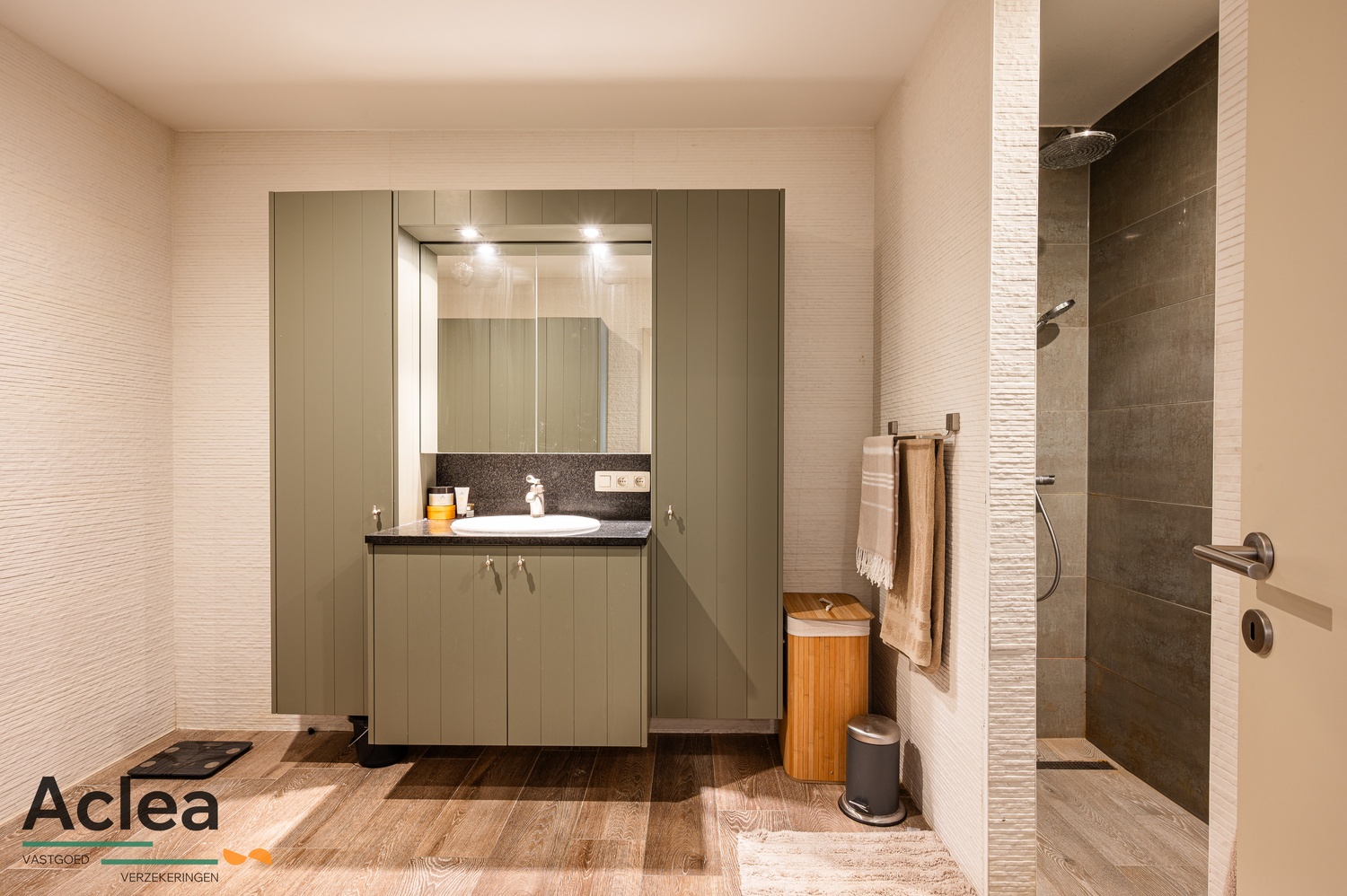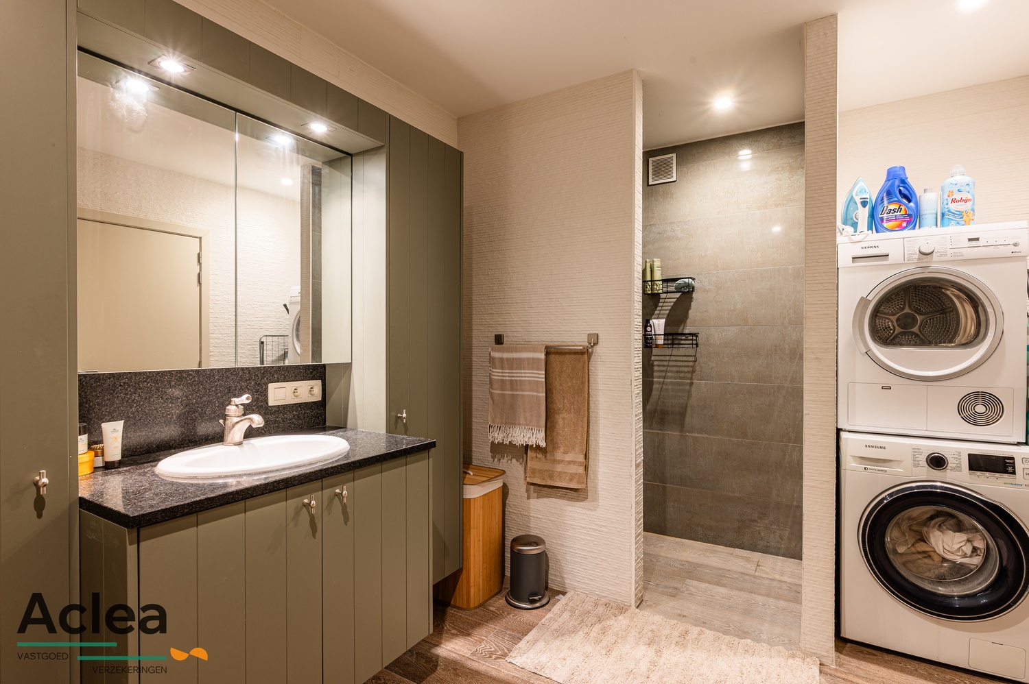 – ruime badkamer met badkamermeubel, kasten, inloopdouche en plaats voor wasmachine