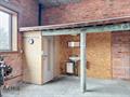 | grote loods met hoge inrijpoort, toilet en lavabo | |