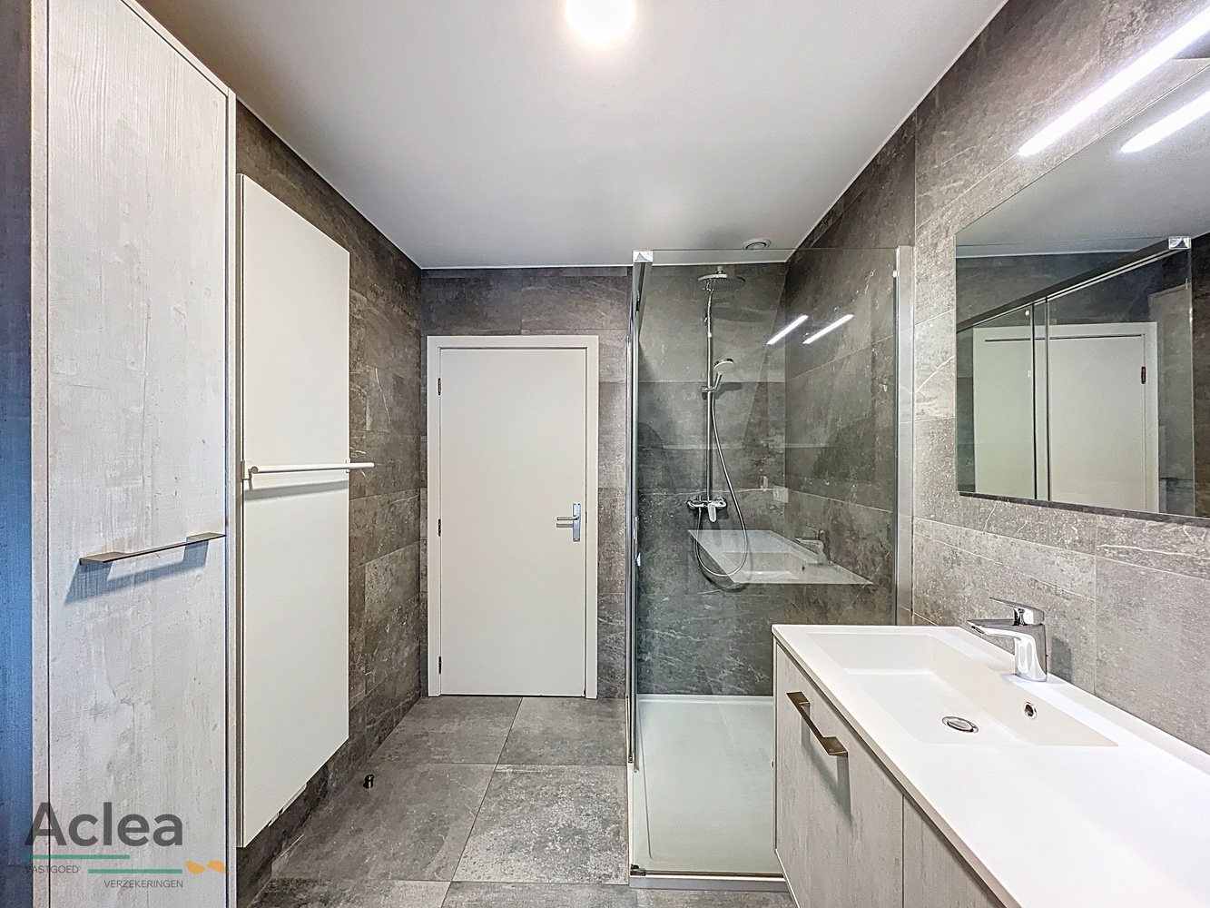 – moderne badkamer met inloopdouche, toilet en badkamermeubel