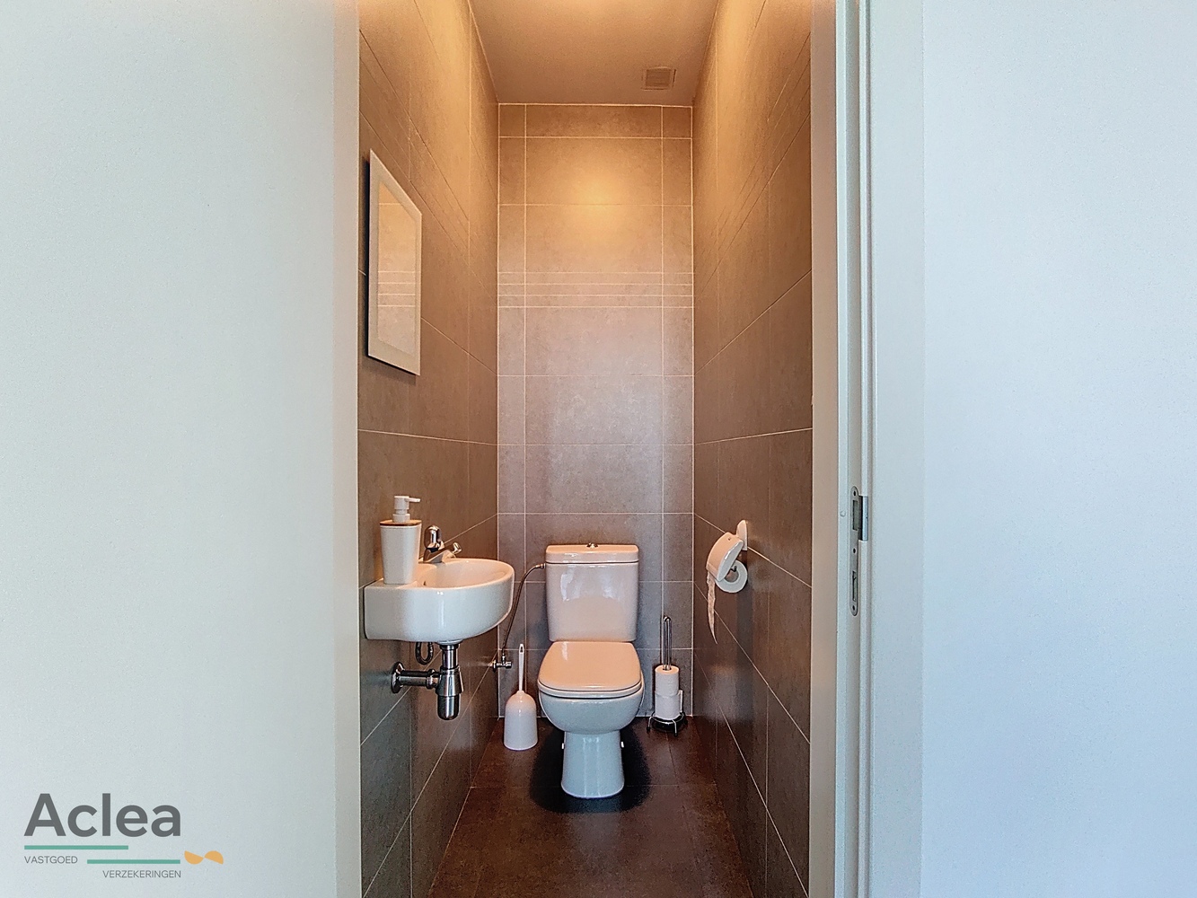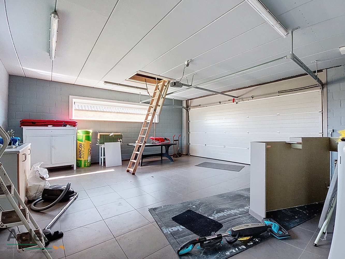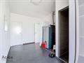 Op het gelijkvloers is er een inkomhal, een ruime living met houtcassette en aanpalend terras achteraan, een open ingerichte keuken, berging, achterinkom met doucheruimte, apart toilet, dubbele garage met zolder en 1 slaapkamer/bureau beneden
