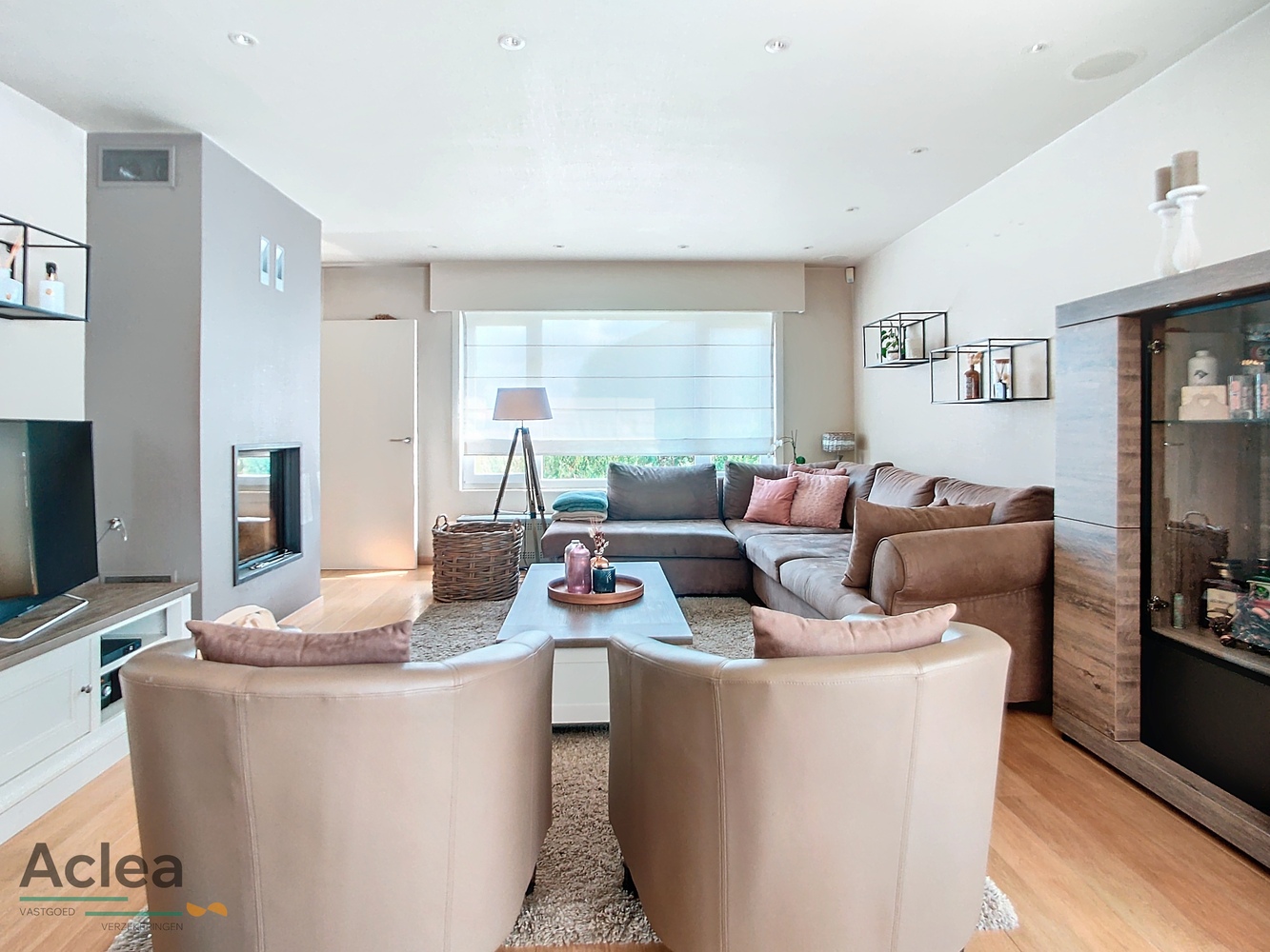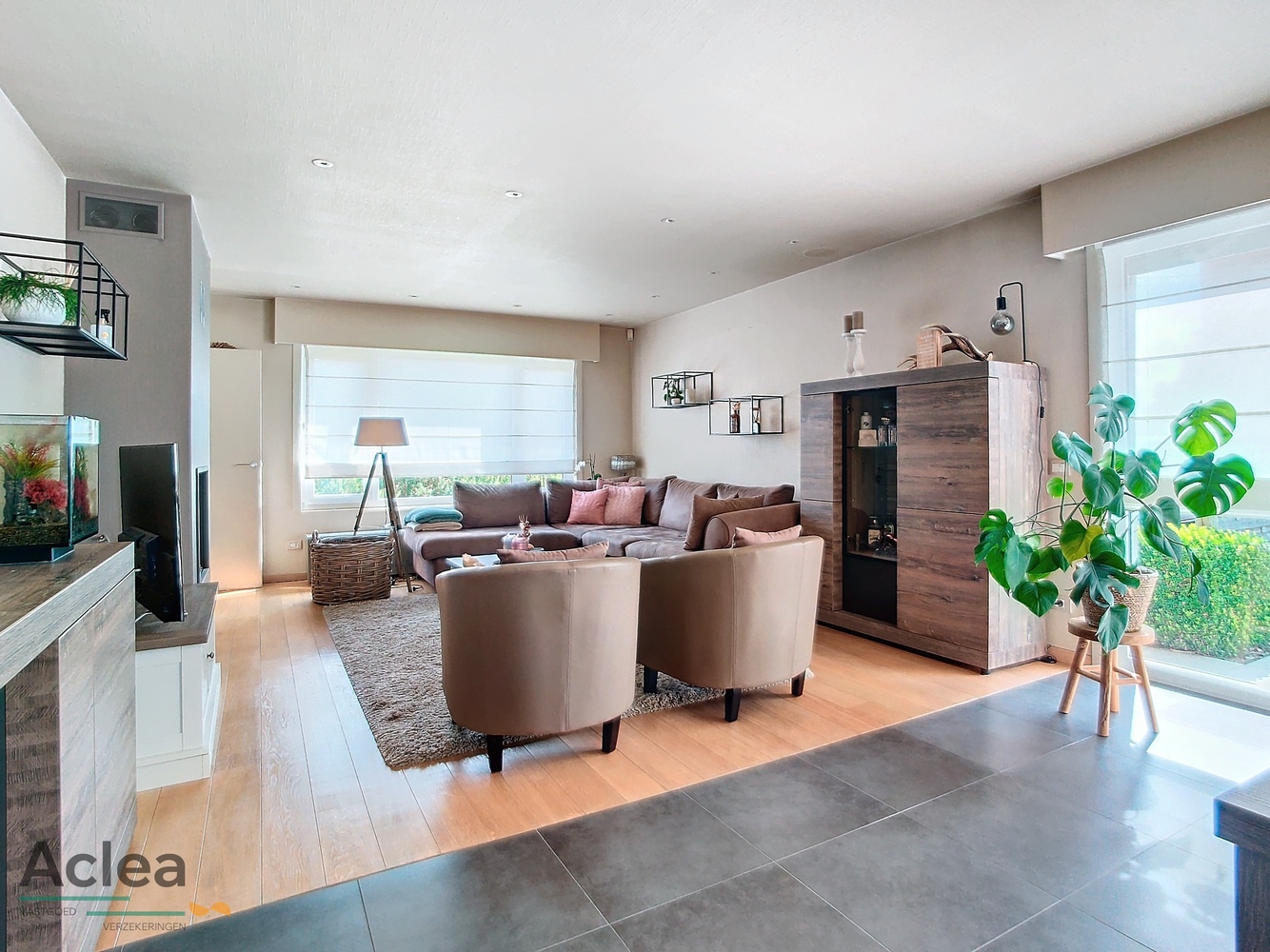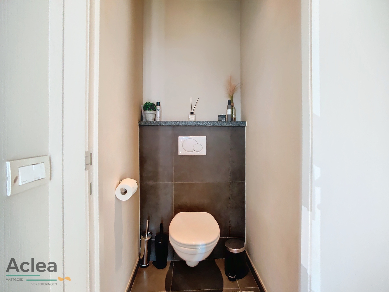 inkomhal, toilet, berging, lichtrijke living met open ingerichte keuken, berging, 3 ruime slaapkamers op eerste verdiep, badkamer met lavabomeubel en inloopdouche, zonnig terras met een deel overdekt terras, garage en 2 autostaanplaatsen naast de woning.