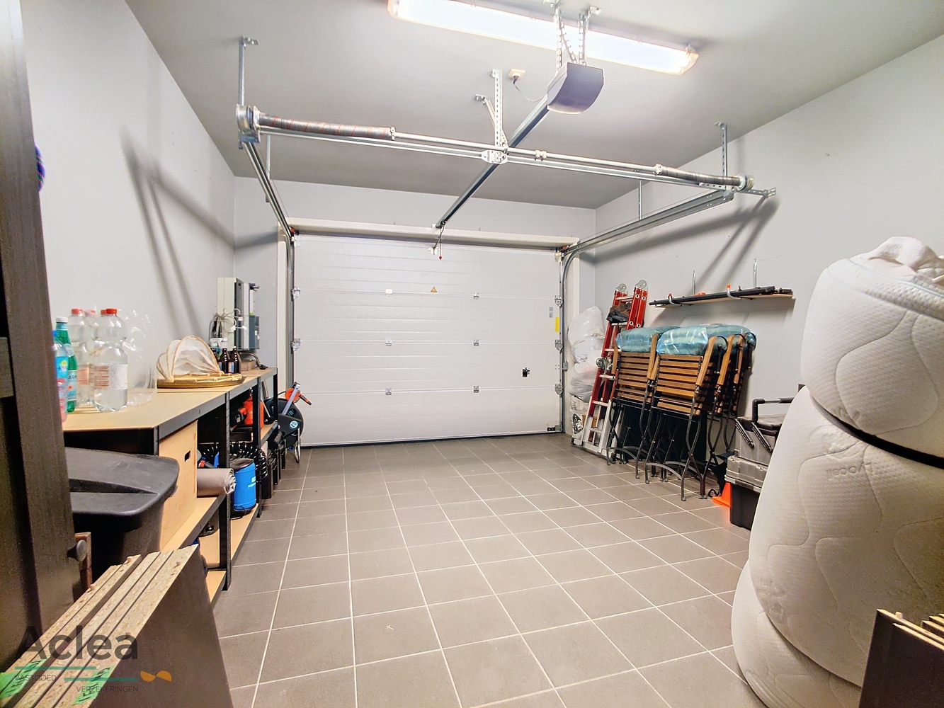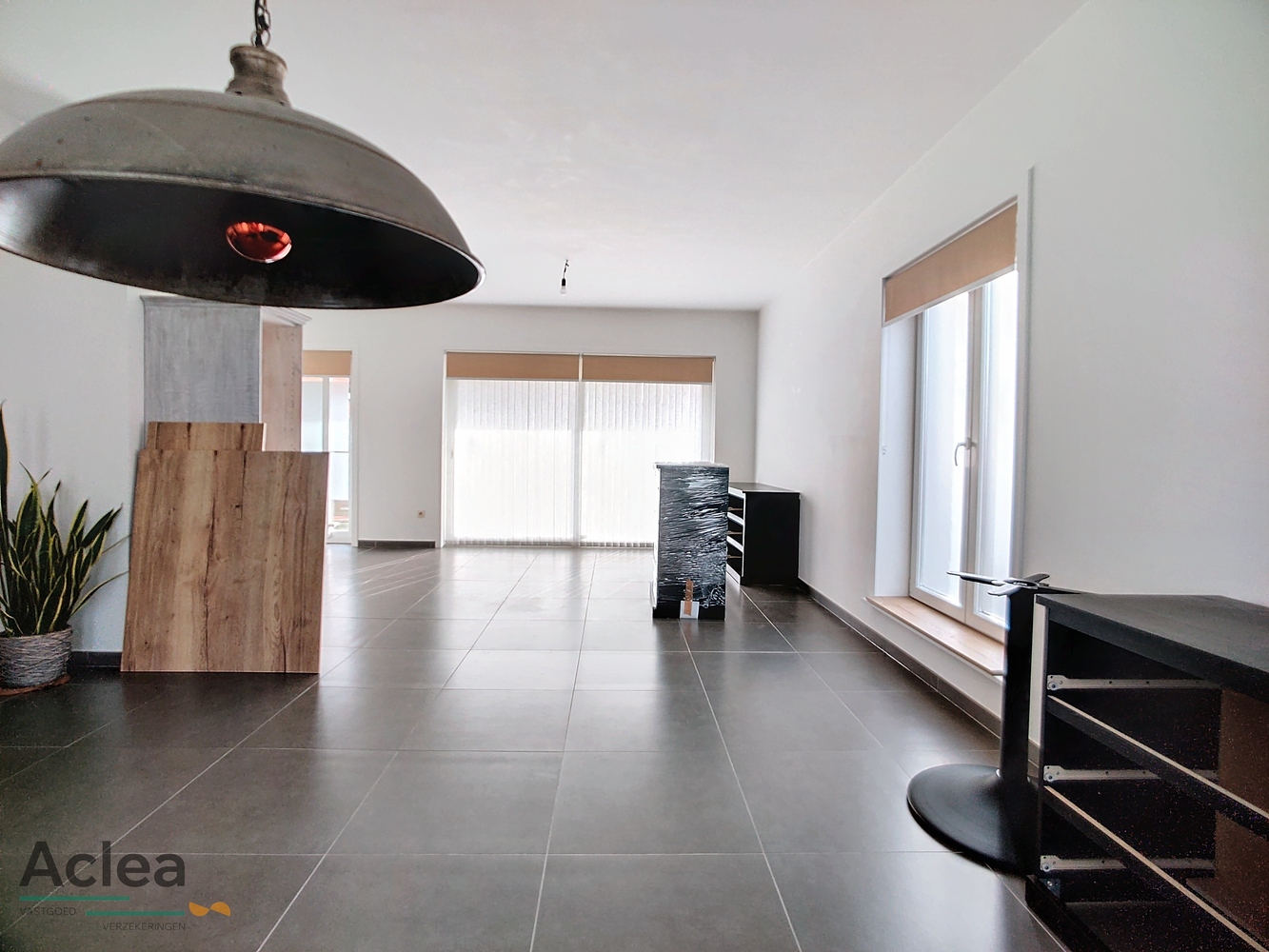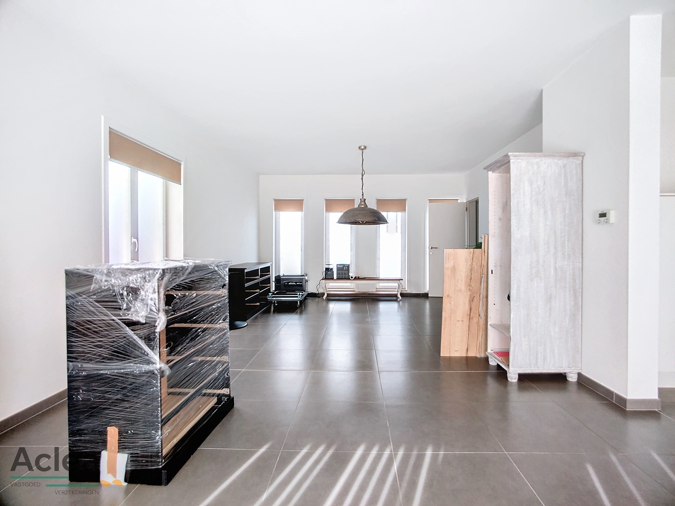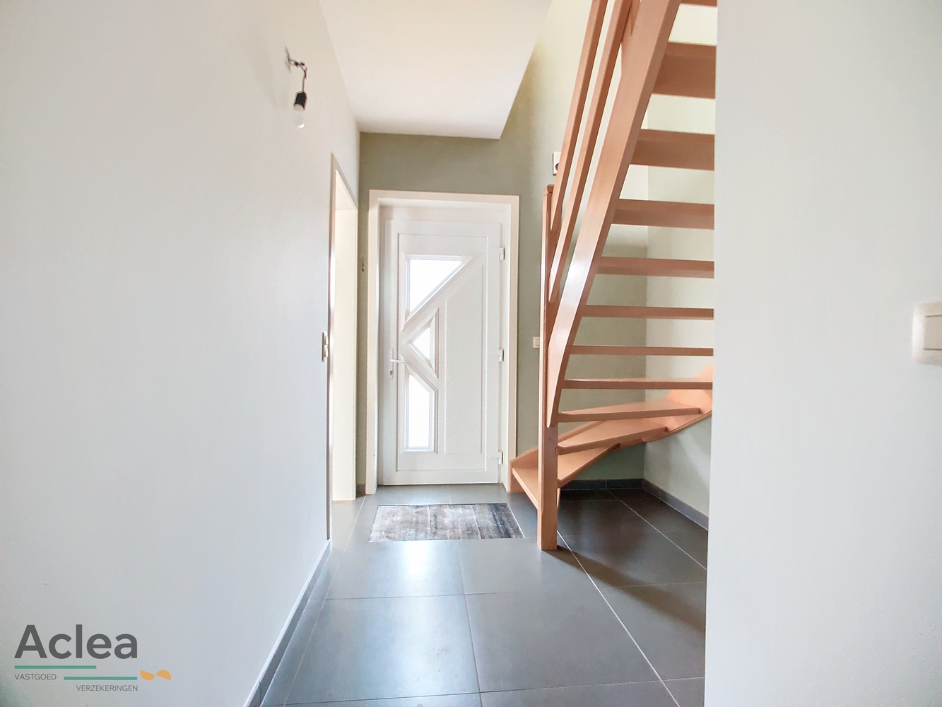 Inkom, toilet, living met open ingerichte keuken, achterinkom/wasplaats, inpandige garage, 3 ruime slaapkamers, bureau/berging, ruime badkamer met toilet, labavomeubel, douche en bad, ruim terras achteraan en parkeerplaats naast de woning.