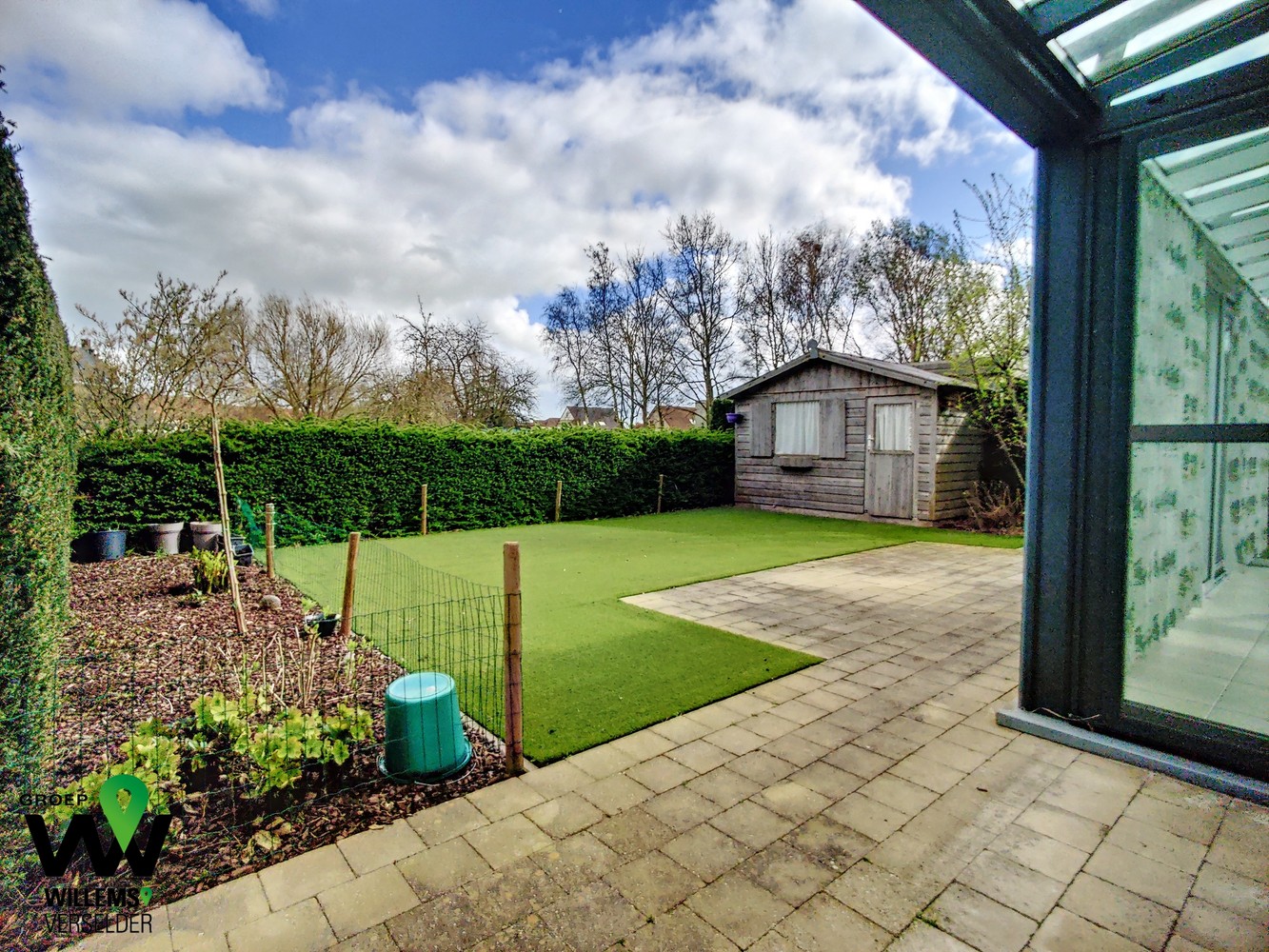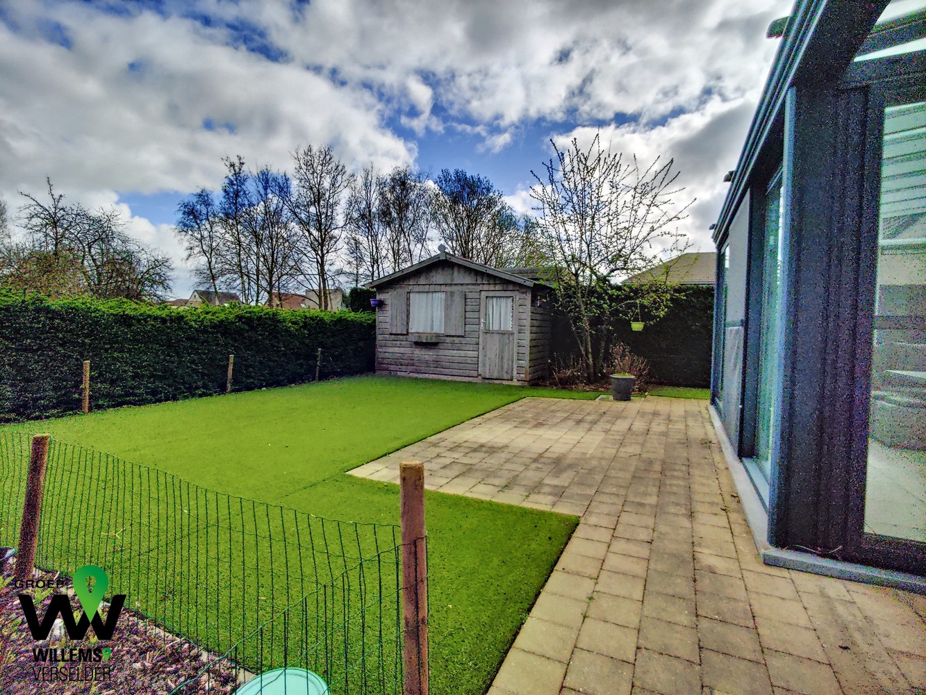 – tuin in kunstgras met tuinhuis