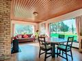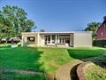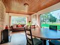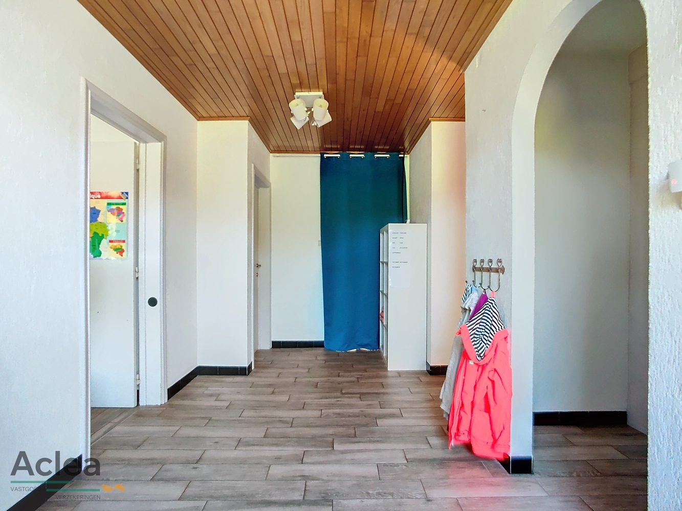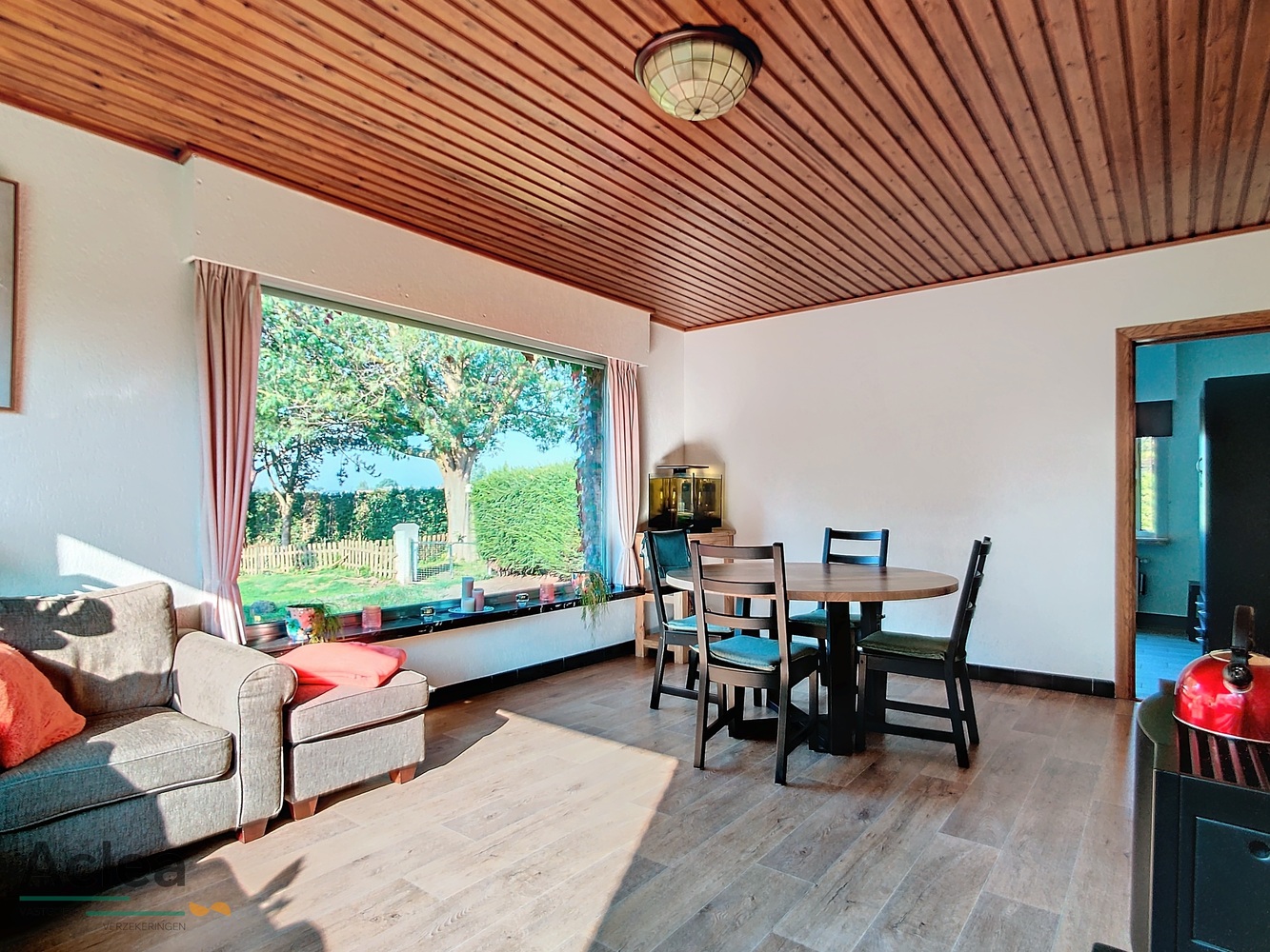 inkomhal met inbouwkast, toilet, woonkamer met zicht op de grote tuin, keuken, badkamer met lavabo en ligbad, 3 slaapkamers, garage, terras en ruime berging/bijhuis in de heel ruime gezellige tuin.